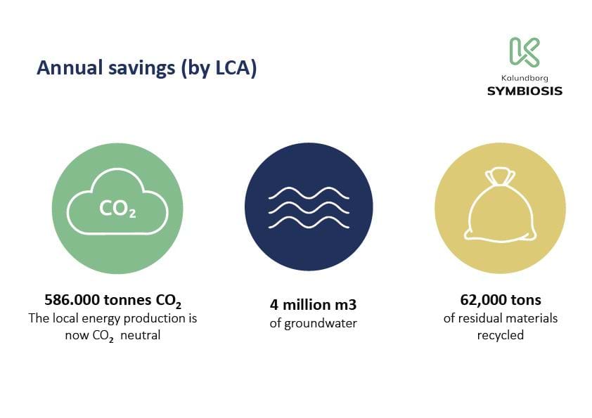 Kalundborg Symbiosen har udført en livscyklusanalyse for at illustrere hvilken effekt symbiosesamarbejdet har på bla. CO2, vandforbrug og materiale genanvendelse, se Figur 7.