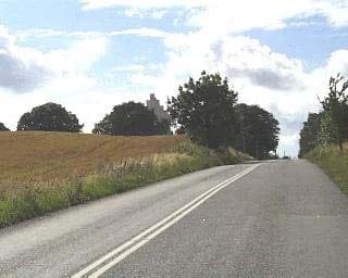 Foto: 4 Ved ankomst i byen afdækker terrænet og træerne kirken, der flot bliver byens dignitar. Set fra Eskebjergvej.