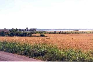 Set fra Bakkendrupvej: Kirken markerer sig inde over markerne i en klynge af træer.