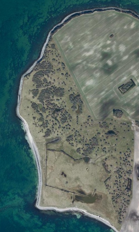 - De græssede strandenge neden for bakken med kreaturhegn og grøfter