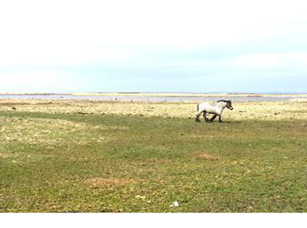 De græssede strandenge på Skiften med Reersø by i horisonten, fra nordøst.