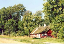 Rødmalet skovarbejderhus, kaldet ”Pyromanens hus”, i Skovhave ud til vejen mellem Kongens Mølle og Astrup.
