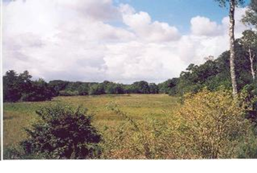 Udsigt fra nordøst over terrænet med mose nord for Avnsøgård.