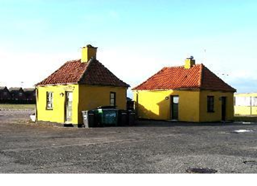 To små bygninger på havnen, der tidligere havde tilknytning til stedets kalkovne, fungerer nu som hhv. havnekontor og toilet, fra sydvest.
