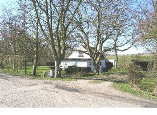 Lille hvidkalket husmandssted med frugthave i den sydøstlige udkant af landsbyen, fra øst.