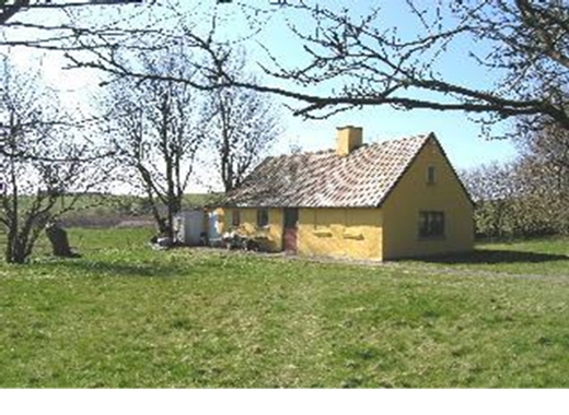 Lille, grundmuret, gulkalket hus yderst i landsbyen mod