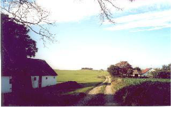Bemærk den fine gamle brobelægning. Endvidere ses kampestensbygget længe. En byggeform der er sjældent på øen. (Længen ligger nordsyd).
