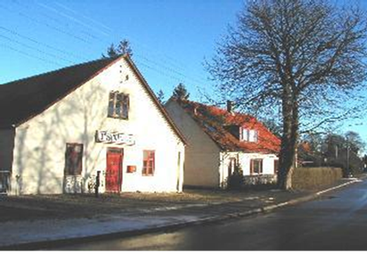 Landsbyens forsamlingshus bag mejeriet mellem den nyere del af landsbyen og den gamle, fra øst.