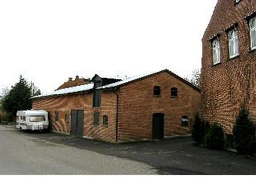 Ombygget frugtpakhus mellem villa og frugtplantage ved Værslevvej, fra vest.