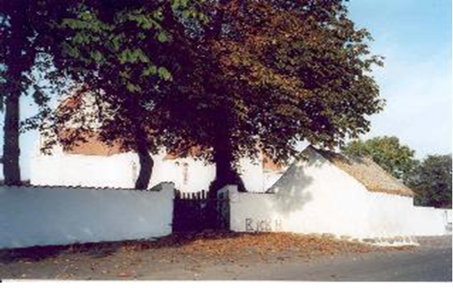 Grundmurede bygninger på Sejerbyvej lige nord for kirken.