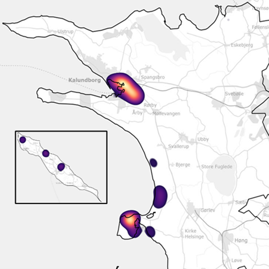 Figur 12 Risikokortlægningen for økonomiske skader efter stormfloder viser, at det særligt er Kalundborg by og Reersø hvor der kan ske store skader hvis ikke der udføres klimasikringer. Sommerhusområder langs storebæltskysten og Sejerø kan også få skader.