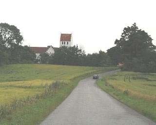 Fra syd ad Stensbjergvej: Et værdifuldt indsyn til kirken og rolige landskab.