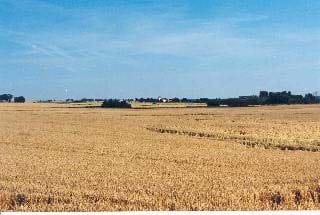 Set fra Bakkendrupvej: Kirken markerer sig inde over markerne i en klynge af træer.