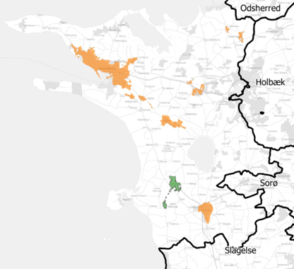 Kort over fjernvarmeområderne i Kalundborg Kommune. Eksisterende områder med fjernvarme er orange, nye fjernvarmeområder er grønne.