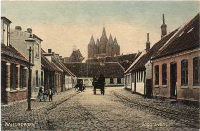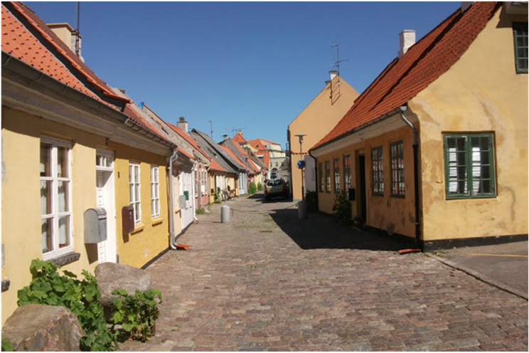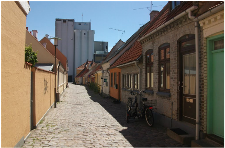 - Den tætte gadestruktur med de bugtede forløb, dannet fra ca. 1800 og ca. 100 år frem.