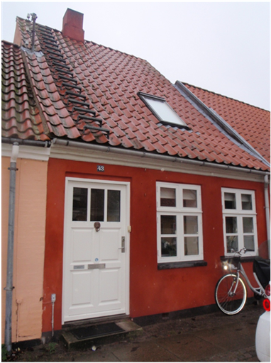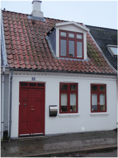 heltag. Huset rummer to beboelser med fælles entré. De tre fag længst mod højre er udstykket i 1846 og de to
