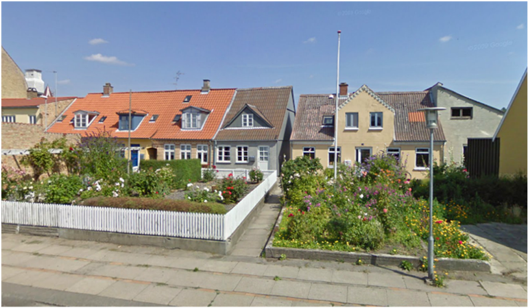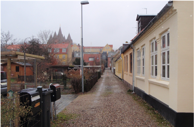 mod øst og små haver, der i dag ofte tjener som parkering mod vest.