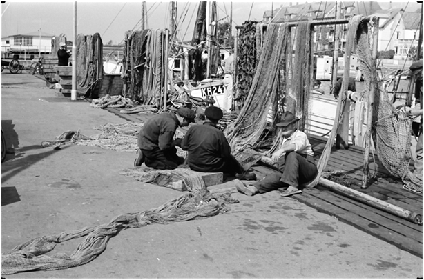 Foto fra ca. 1960, stemningsfoto fra fiskerihavnen. Til venstre i billedet ses sejlklubbens klubhus.