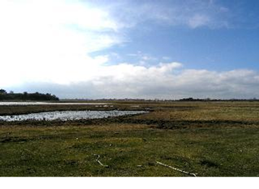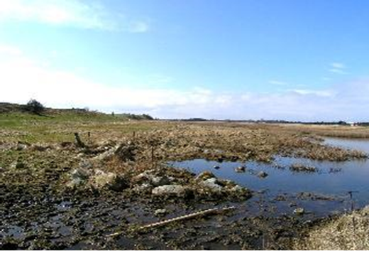 Strandengene ved Flasken, hvor Halleby Å løber ud i Storebælt, fra syd.