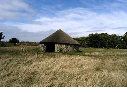 Strandgårdens runde, stråtækte kampestensfårehus fra ca. 1907 på strandoverdrevet ned mod Vejlen nord for landsbyen, fra syd.