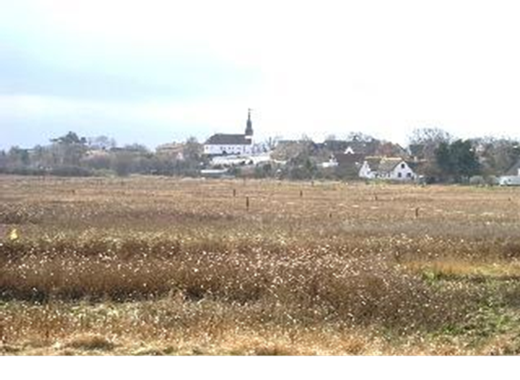 De græssede strandenge på Skiften med Reersø by i horisonten, fra nordøst.