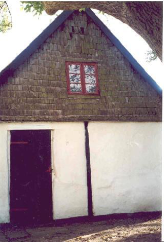 Stuehusets spåntækkede vestgavl. Spåntækning ses sjældent i vore dage.