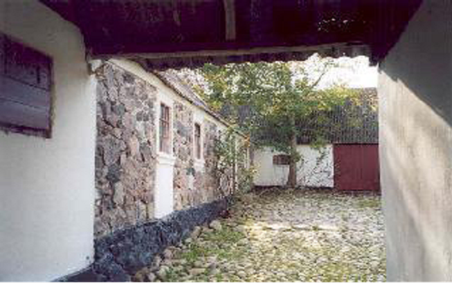 Bemærk den fine gamle brobelægning. Endvidere ses kampestensbygget længe. En byggeform der er sjældent på øen. (Længen ligger nordsyd).