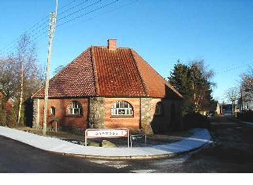 Landsbyens yngre skolebygning fra 1909 i tidlig "Bedre Byggeskik"-stil, i brug til ca. 1965, fra vest.