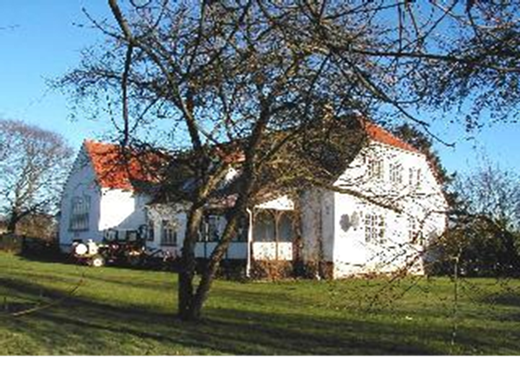 Reerslevs grundmurede, hvidkalkede præstegård fra ca. 1850 ligger højt allernordligst i landsbyen med vidt udsyn til alle sider, fra nordvest.