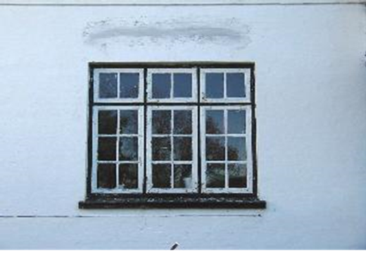 vinduesrammer og solbænk og hvide vinduer, på skolebygningens vestside, fra vest.