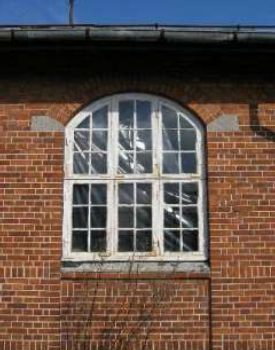 Gørlev Station, oprindeligt vindue i vestfacaden med mønstermuring og "romansk" vinduesstik, set fra vest.