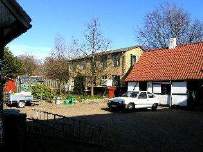 Gårdrummet til "Dyrlægegården", med bindingsværkslænger og fint grundmuret tømrerværksted bagest, set fra vest.