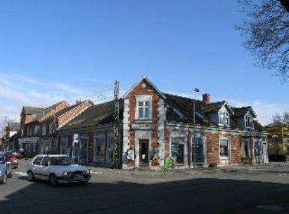 Det tidligere apotek (nu boliger) ved Østerled, opført i 1908, i røde mursten med sandstensgesimser og -relief i