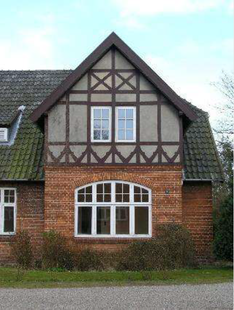 Sukkerfabrikkens funktionærboliger, gavlkvist med imiteret bindingsværk, fra nord.