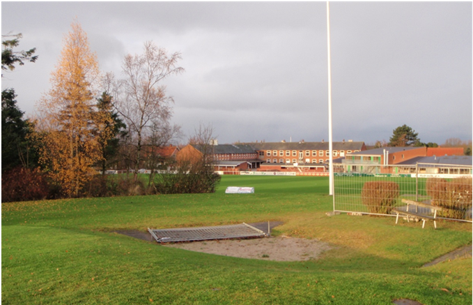 2012, skolen set fra idrætsanlægget i nord. Før skolen ses stadion.