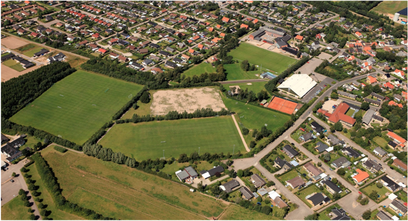 Luftfoto – 2012 over Svebølle, hvor den nøje planlagte placering af anlæggets store flader ses tydeligt med velintegreret stisystemer og bevoksning.